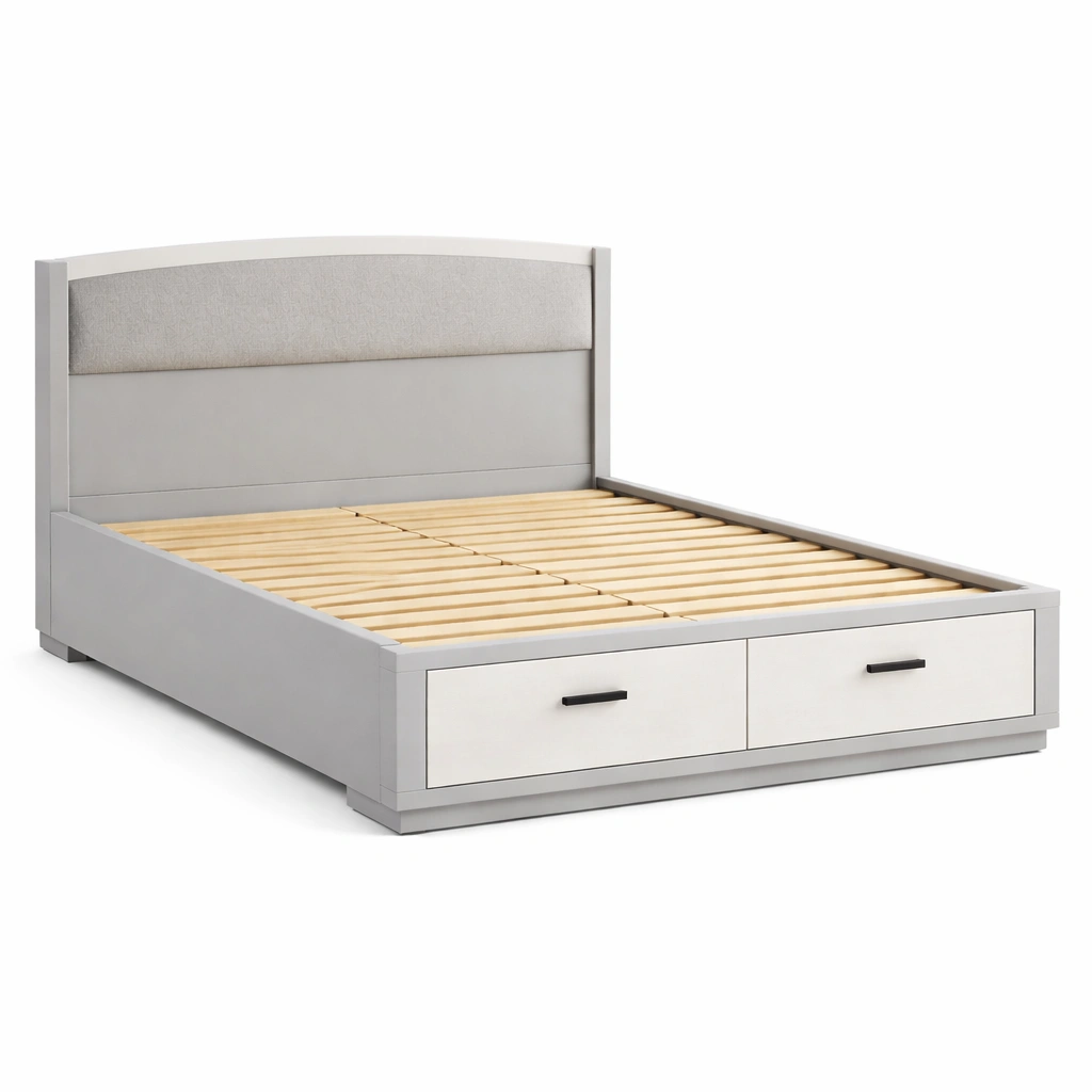 Dieses Doppelbett besteht aus einem stabilen Holzrahmen mit Lamellen aus Kiefernholz und einem gepolsterten Kopfteil aus Polyestergewebe. Es ist in Grau gehalten und verfügt über zwei Schubladen am Fußende für zusätzlichen Stauraum. Die Maße des Bettes sind 200 cm in der Länge, 160 cm in der Breite und 100 cm in der Höhe. Kompatibel mit Matratzen der Größe 160 x 200 cm.